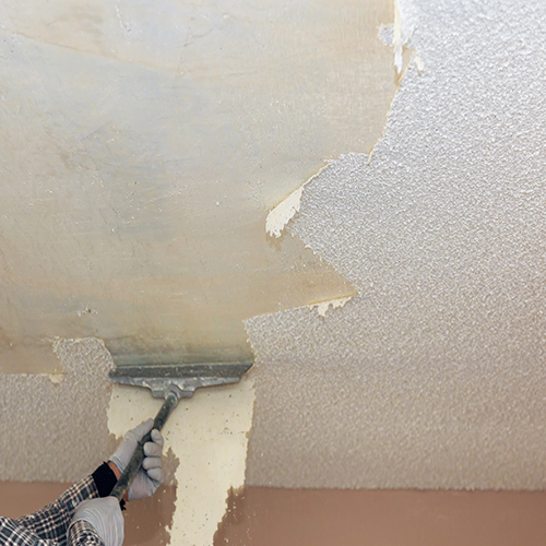 Many homes built in the late 1930s through the 1990s have popcorn ceilings or some type of texture applied overhead. It was used to cover up a lot of flaws in the ceiling. It was time-effective and cost-efficient. Often called an acoustic ceiling, it also served the purpose to absorb sound and reduce noise. These ceilings resemble cottage cheese. You’ll essentially have bumpy stuff stuck to your ceiling. Some have 1970-era sparkles embedded in them. Some popcorn ceilings contain asbestos. Asbestos is a generic term used to describe any of six naturally occurring fibrous materials. Because of its positive qualities, such as its strength and heat resistance, it was widely used in building construction beginning in the late 1800s. It was commonly used for things like fireproofing material for steel beams and columns, added to concrete, asphalt, floor tiles, pipes, and as a component in mixtures for sprayed-on ceilings and walls.
